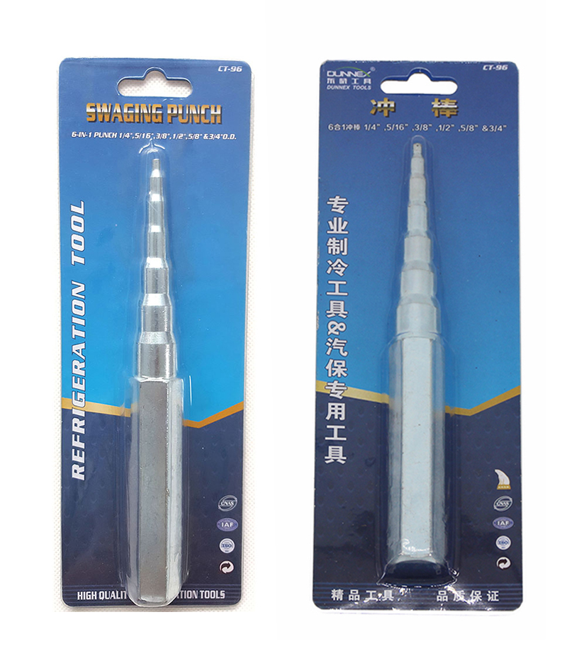 商品详细介绍: 名称:6合1冲棒 型号:CT-96 规格:CT-96:1/4",5/16",3/8",1/2",5/8",3/4"; 包装:塑袋包装+彩盒包装; 用途:制冷专用铜管胀管工具 品牌: