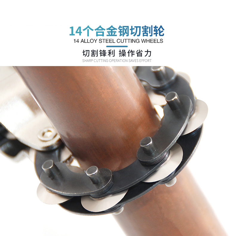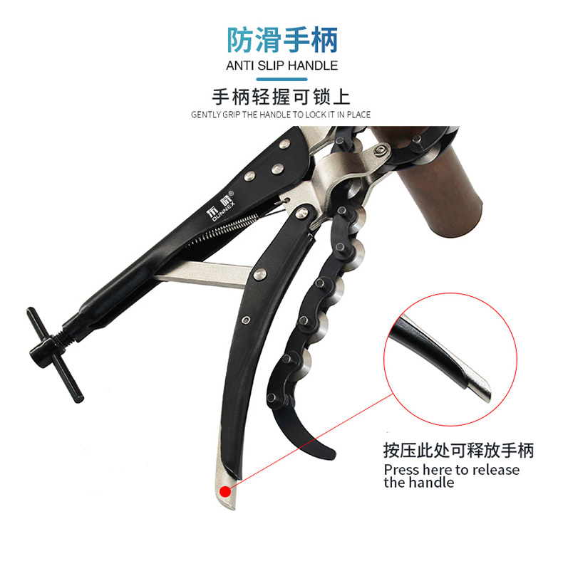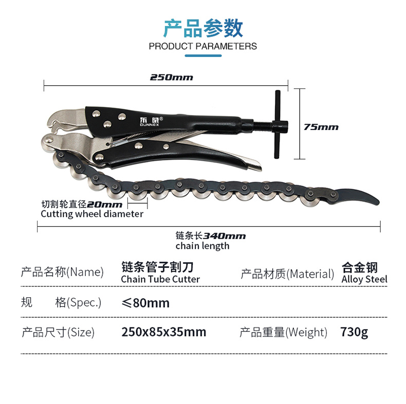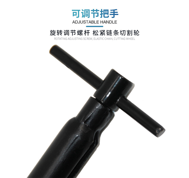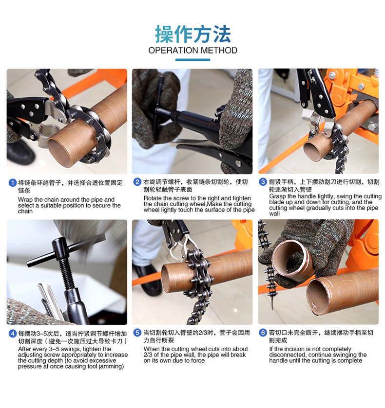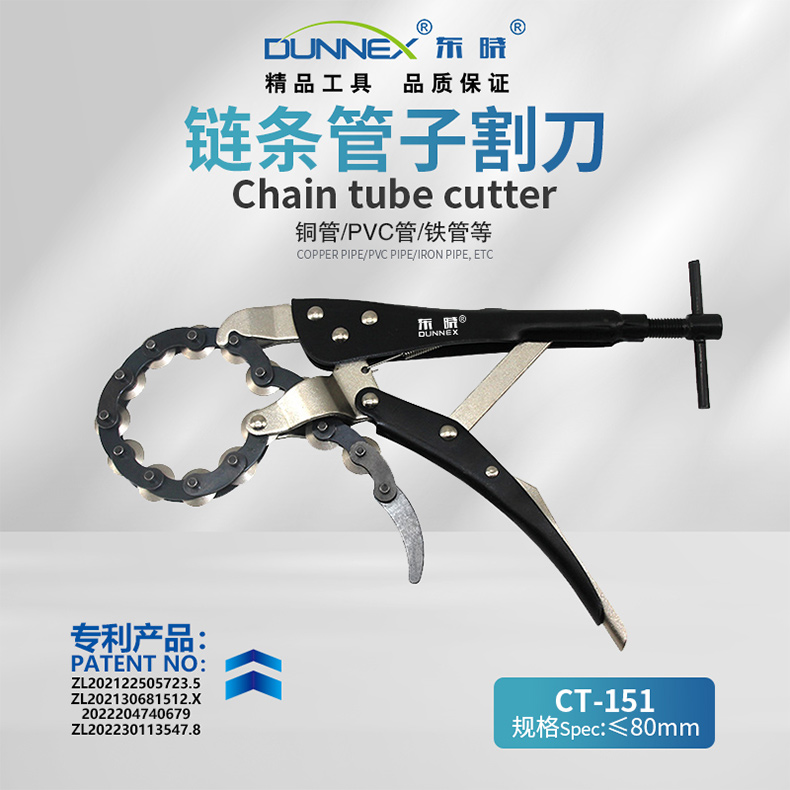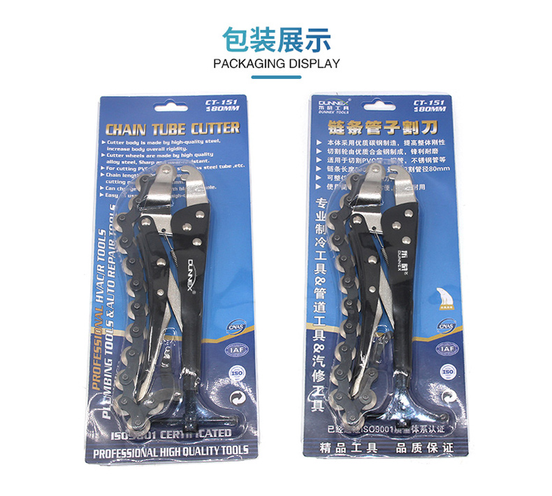名称:链条管子割刀 型号:CT-151 规格:≤80mm 包装:插卡包装 使用范围:切割铁制管、铜管、PVC管(27MM左右厚度薄壁)不可切割不锈钢